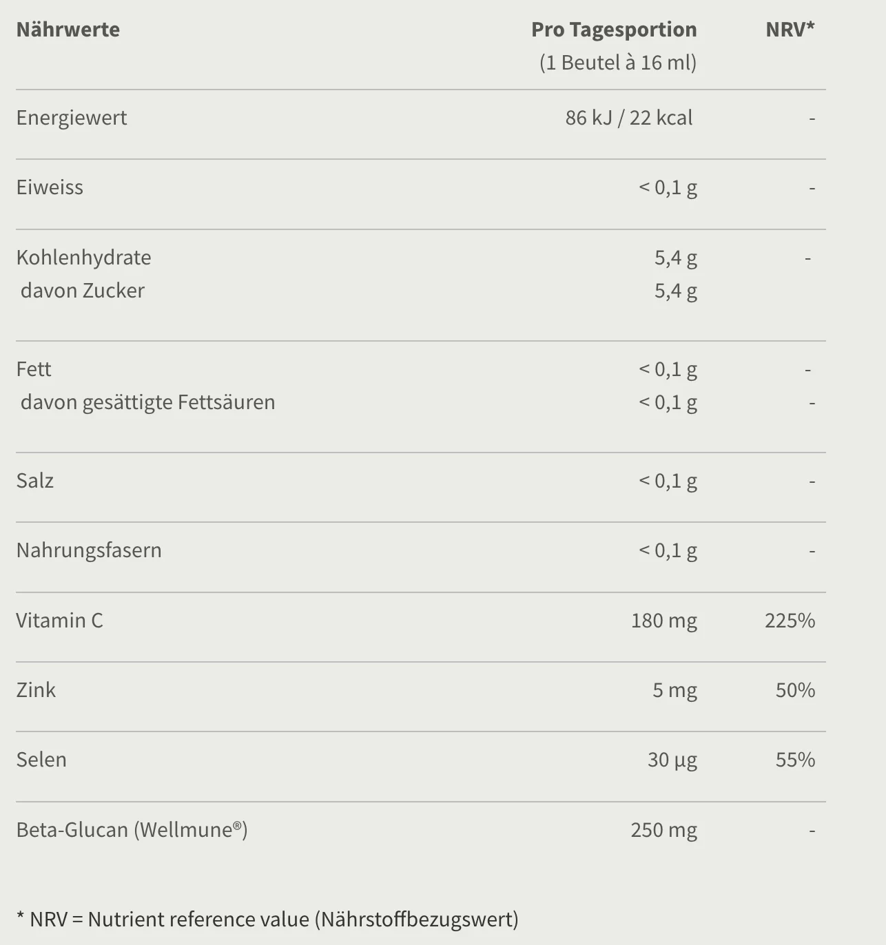 Wasser, Zucker, Holunderbeerensaftkonzentrat (6%), Honig, Beta-Glucan aus Hefe (Saccharomyces cerevisiae) (1,4%), L-Ascorbinsäure, Verdickungsmittel (Gummi arabicum, Xanthan), Zinkgluconat, natürliche Aromen (Holunderblütenextrakt, Lindenblütenextrakt), Konservierungsstoff (Kaliumsorbat), modifizierte Stärke, Natriumselenat.